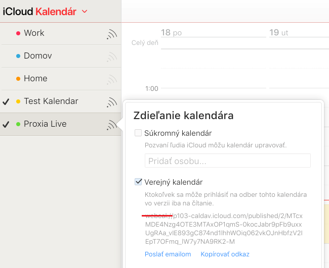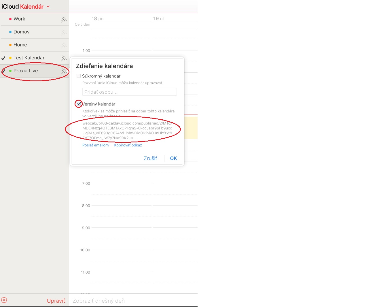 b) Pomenujeme vytvorený kalendár a klikneme naň. Zobrazí sa nám tabuľka a vyberieme možnosť Verejný kalendár. Následne zvolíme Kopírovať odkaz a vložíme link do systému Proxia Live. (z linku odstránime začiatok: webcal:// a vložíme len ďalej pokračujúcu adresu)