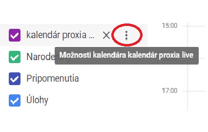 b) Ak sme úspešne vytvorili nový kalendár alebo sme vyhľadali už existujúci kalendár, prejdeme do časti nastavenia, kde vyhľadáme potrebný ICS link, toho kalendáru, ktorý chceme použiť. Zvolíme možnosť NASTAVENIA A ZDIEĽANIE.