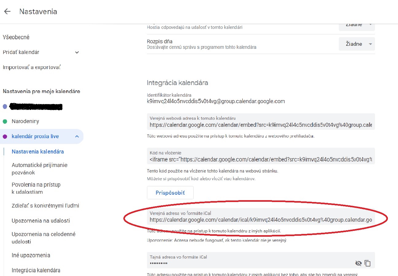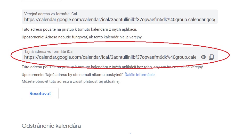 Poznámka: Niekedy je potrebné vložiť TAJNÚ ADRESU VO FORMÁTE ICAL, nakoľko niektoré systémy nepodporujú len Verejnú adresu. Tajnú adresu vo formáte iCal je naprv potrebné odkliknúť cez prečiarknute “očko”.
