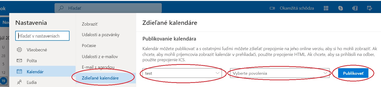 g) postupujeme nasledovne, zvolíme kalendár chceme zdieľať, vyberieme povolenia (Môže zobraziť všetky povinnosti) a klikneme na tlačidlo PUBLIKOVAŤ;
