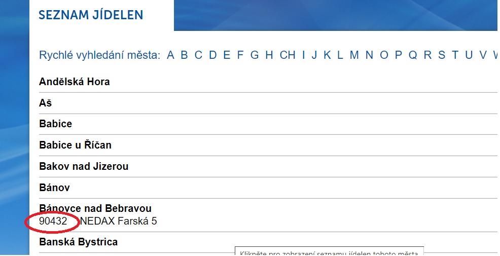 - Zvolíme vhodný názov a zadáme kód jedálne podľa predlohy – otvoríme stránku www.strava.cz, vyhľadáme jedáleň podľa mesta a skopírujeme kód.