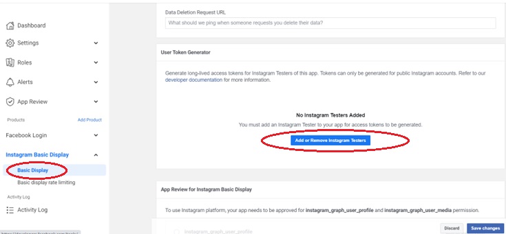 4. Pre vytvorenie Instagram tester, musíme postupovať nasledovne. V ľavej časti vyhľadáme BASIC DISPLAY a klikneme na tlačidlo ADD OR REMOVE INSTAGRAM TESTERS.