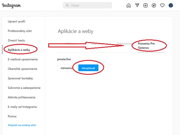 8. V ľavej časti nastavení vyhľadáme APLIKÁCIE A WEBY. V ponuke klikneme na POZVANIE PRE TESTEROV a pozvanie prijmeme tlačidlom AKCEPTOVAŤ.
