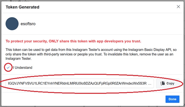 13. V poslednom kroku sme získali prístupový Token, ktorý skopírujeme do systému Proxia.Live, ale najskôr zaškrtneme políčko I UNDERSTAND. Potvrdíme tlačidlom DONE.