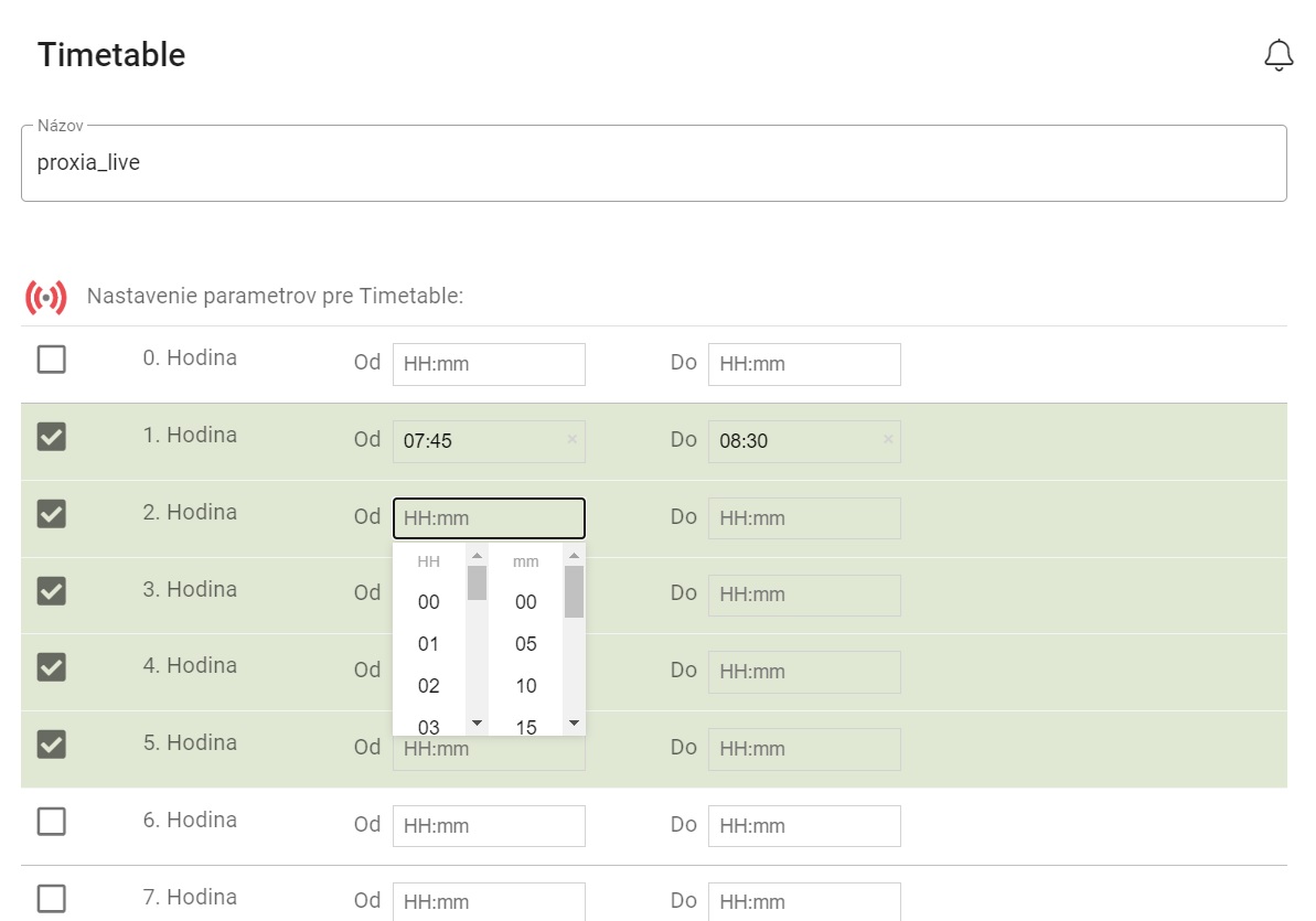 - Zvolíme vhodný názov a odsúhlasíme rozsah hodín, ktorý následne nastavíme podľa potreby na jednotlivé časy zvonenia.